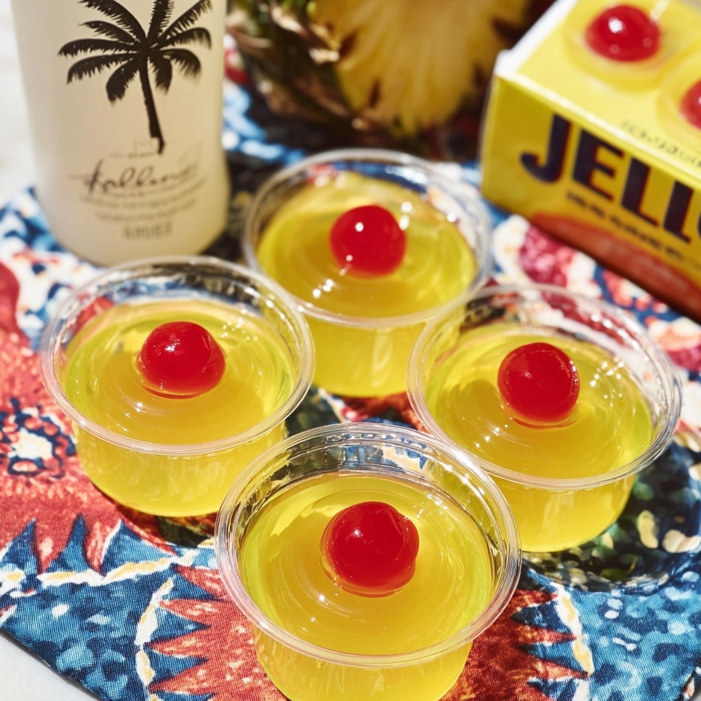 Garnishes elevate these jello shots from simple to spectacular. Fresh pineapple wedges add a juicy burst of freshness that contrasts beautifully with the sweet gelatin, while maraschino cherries add a charming sweet-tart contrast and vibrant color. You can also try a tiny sprig of mint to add an herbal twist or a sprinkle of toasted coconut flakes for extra texture and that unmistakable tropical flair.