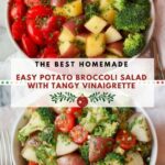 - Toss Salad: Pour the vinaigrette over the warm potatoes and toss gently to coat the cubes with the dressing. Add the steamed broccoli florets and halved cherry tomatoes to the bowl and gently toss everything together until combined.