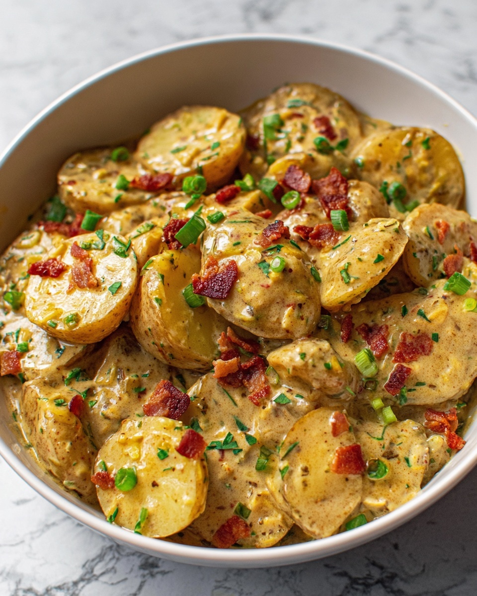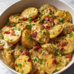 A flavorful and hearty Potato Salad with crispy bacon, tangy dressing, and fresh herbs, perfect as a side dish for any occasion. This recipe features tender Yukon Gold potatoes boiled to perfection and tossed with a smoky, creamy dressing made with bacon fat, mayonnaise, and smoked paprika.