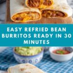Delicious and easy-to-make refried bean burritos, filled with a flavorful blend of refried beans, salsa, onion, and spices, topped with melted cheddar cheese, wrapped in soft flour tortillas, and baked to perfection. A great vegetarian meal option that can also be prepared ahead and frozen for convenient reheating.