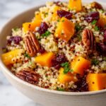 To elevate your Roasted Pumpkin, Pecan & Cranberry Quinoa Salad Recipe, try garnishing with a sprinkle of extra chopped pecans for crunch or some crumbled goat cheese or feta to add a creamy, tangy element that complements the sweetness of the pumpkin. A few fresh parsley leaves or a zest of lemon can also brighten the presentation and flavor.