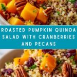 This Roasted Pumpkin, Pecan & Cranberry Quinoa Salad is a hearty and wholesome dish perfect for fall. Featuring tender roasted pumpkin cubes seasoned with cinnamon, nutty quinoa, crunchy pecans, and sweet dried cranberries, all tossed in a tangy maple apple cider vinaigrette. It’s a warm or chilled vegetarian salad packed with flavor and nutrition, ideal as a main or side dish.