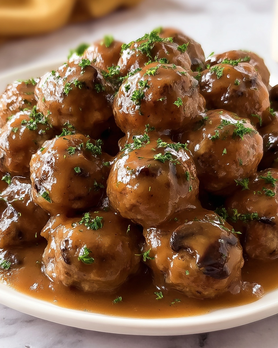 For a fun twist, try skewering the meatballs and serving them as individual bites with sauce drizzled on top. Or, create mini sliders using soft rolls and topping them with a spoonful of mushroom sauce. It’s a crowd-pleaser that’s great for entertaining or casual family dinners.