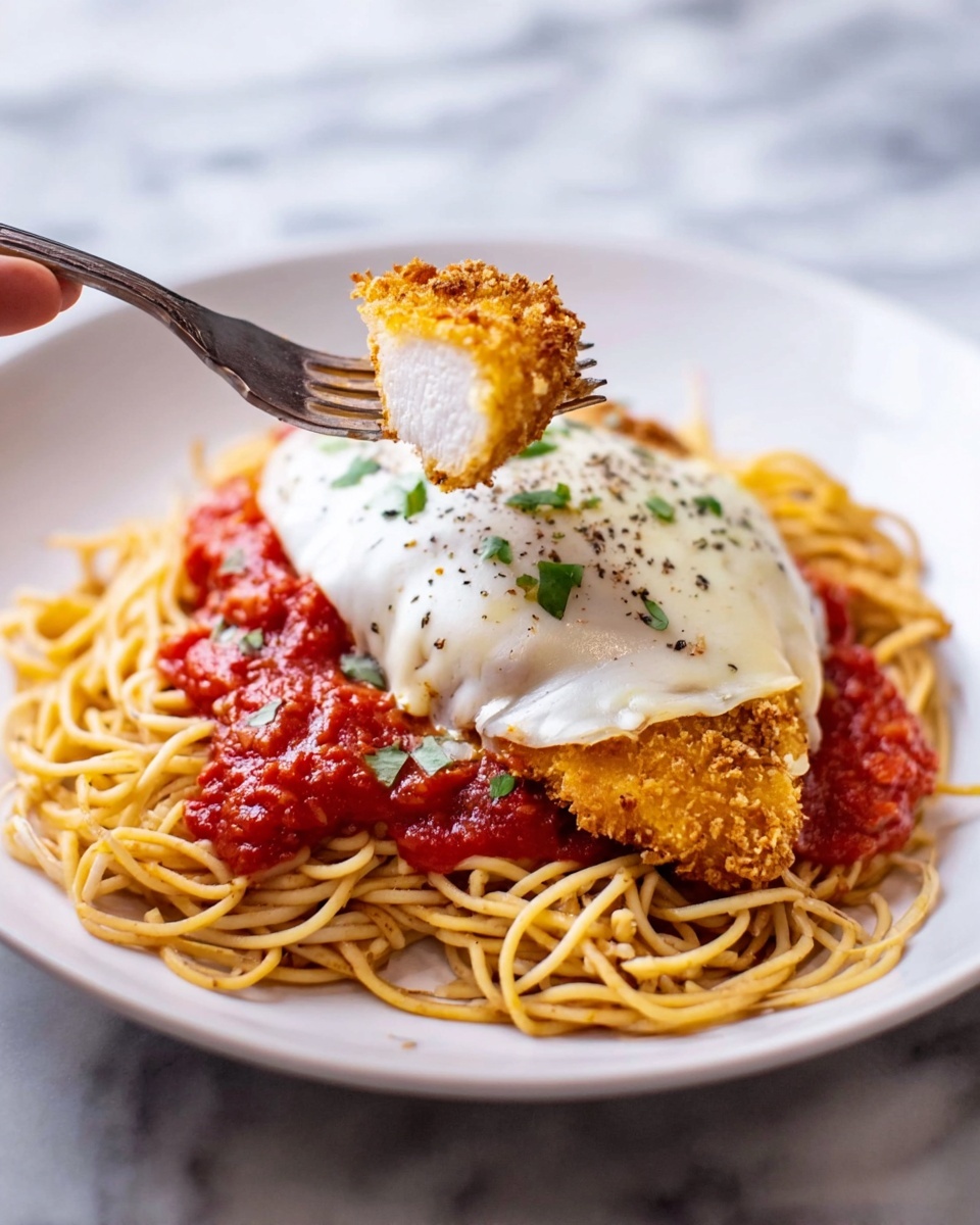 Classic spaghetti perfectly complements the sauce, but you can also serve this chicken Parmesan alongside creamy risotto, buttery garlic mashed potatoes, or a simple green salad for a lighter touch. Each side dish soaks up the sauce differently, giving you flexibility with every meal.