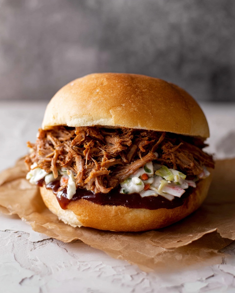 Now the fun part! On each toasted bun, spread your favorite BBQ sauce, pile on the pulled pork, and top with a generous helping of the tangy apple slaw. Close it up, grab with both hands, and get ready to savor flavors that marry smoky, sweet, tangy, and fresh in perfect harmony.