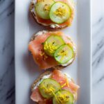Spread a generous layer of your lemon truffle mayo on each baguette slice. Then, artfully layer a slice of smoked salmon over the mayo, followed by one or two thin cucumber slices. The cucumber not only adds crunch but also a refreshing coolness that balances the smoky salmon’s intensity. If you want to make your canapes extra special, sprinkle a little extra lemon zest on top for a bright pop of color and flavor.