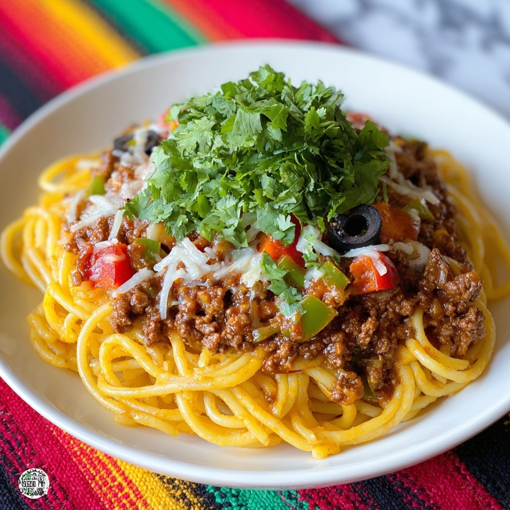 A vibrant and hearty Spicy Mexican Baked Spaghetti combining classic Italian pasta with bold Mexican flavors. Ground beef, bell peppers, and aromatic spices meld together in a rich tomato sauce, baked until bubbly and topped with melted Mexican cheese for a comforting and flavorful twist.