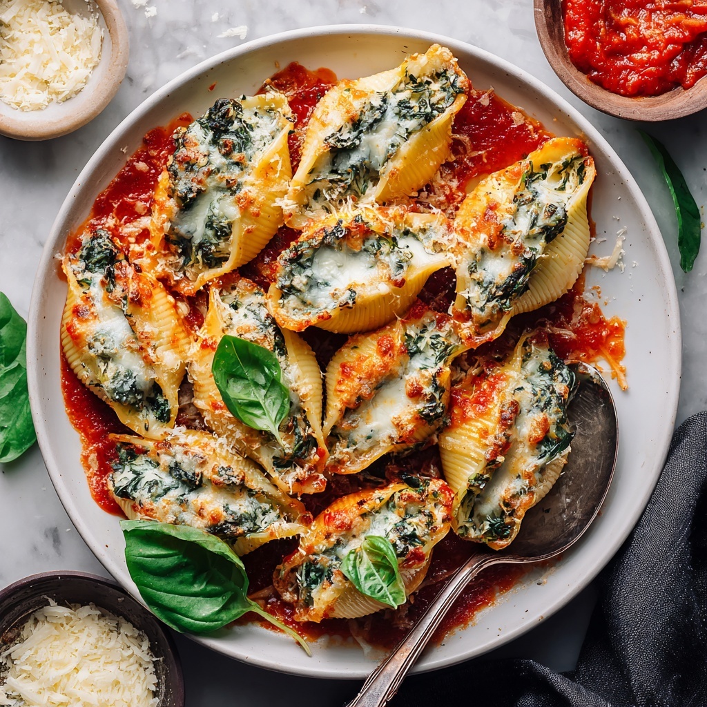 Delicious and comforting Spinach & Ricotta Stuffed Shells make a perfect vegetarian meal. Jumbo pasta shells are filled with a creamy mixture of ricotta, mozzarella, Parmesan cheeses, fresh spinach, and herbs, then baked in marinara sauce until bubbly and golden. This Italian-inspired dish is perfect for a cozy family dinner or special occasion.