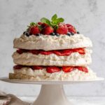 - Assemble the Cake: Place one meringue layer on a serving plate. Spread a generous layer of whipped cream over it, then arrange a layer of sliced strawberries and sprinkle some blueberries on top. Add a few fresh mint leaves for flavor and decoration. Repeat the layering with the remaining meringue layers, whipped cream, and berries. Garnish the top with additional fresh strawberries, blueberries, and mint leaves. Serve immediately or refrigerate until ready to serve.