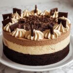 This Tuxedo Cake is a decadent triple chocolate mousse cake featuring layers of moist cocoa cake paired with rich dark, milk, and white chocolate mousses. Perfect for chocolate lovers, this impressive dessert combines a tender cake base with smooth, airy mousse layers for an indulgent treat.